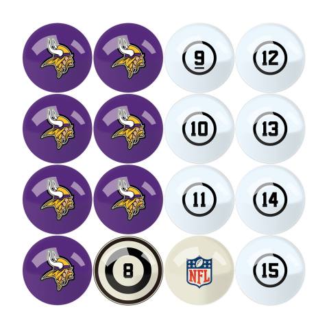 This awesome Minnesota Vikings billiard ball set comes complete with referee eight ball and NFL cue ball.